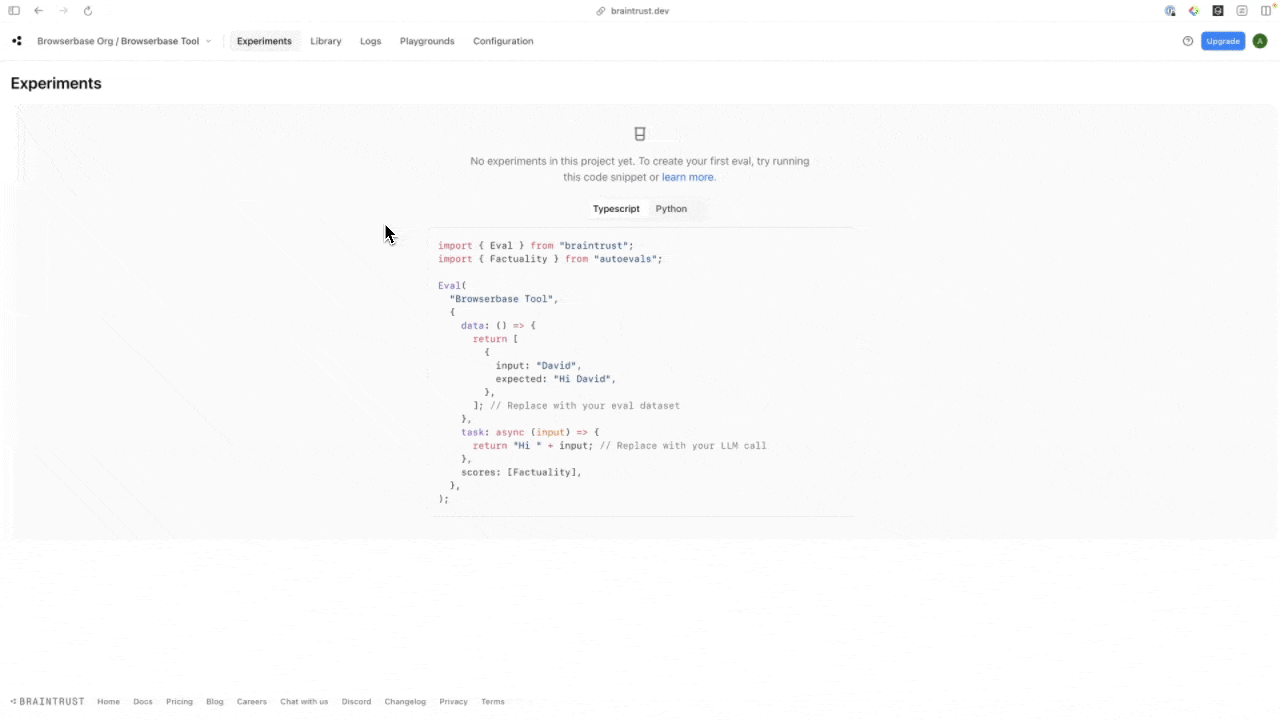 Running your existing code in Braintrust works well with Browserbase as a tool.Tools can be created through code. Let’s define a load function that fetches and returns the page content from a given URL.Here’s an example of how to modify your existing code to use Browserbase as a tool in Braintrust:
