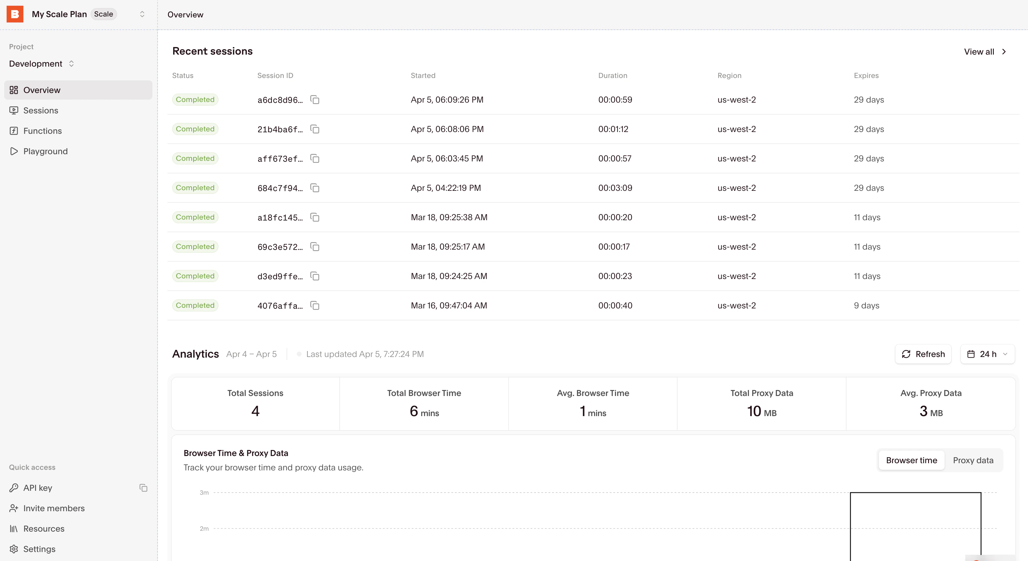 The overview dashboard is the first page you’ll see when you log in to Browserbase and click into a project. It gives you a quick snapshot of your browser sessions, usage, and status.