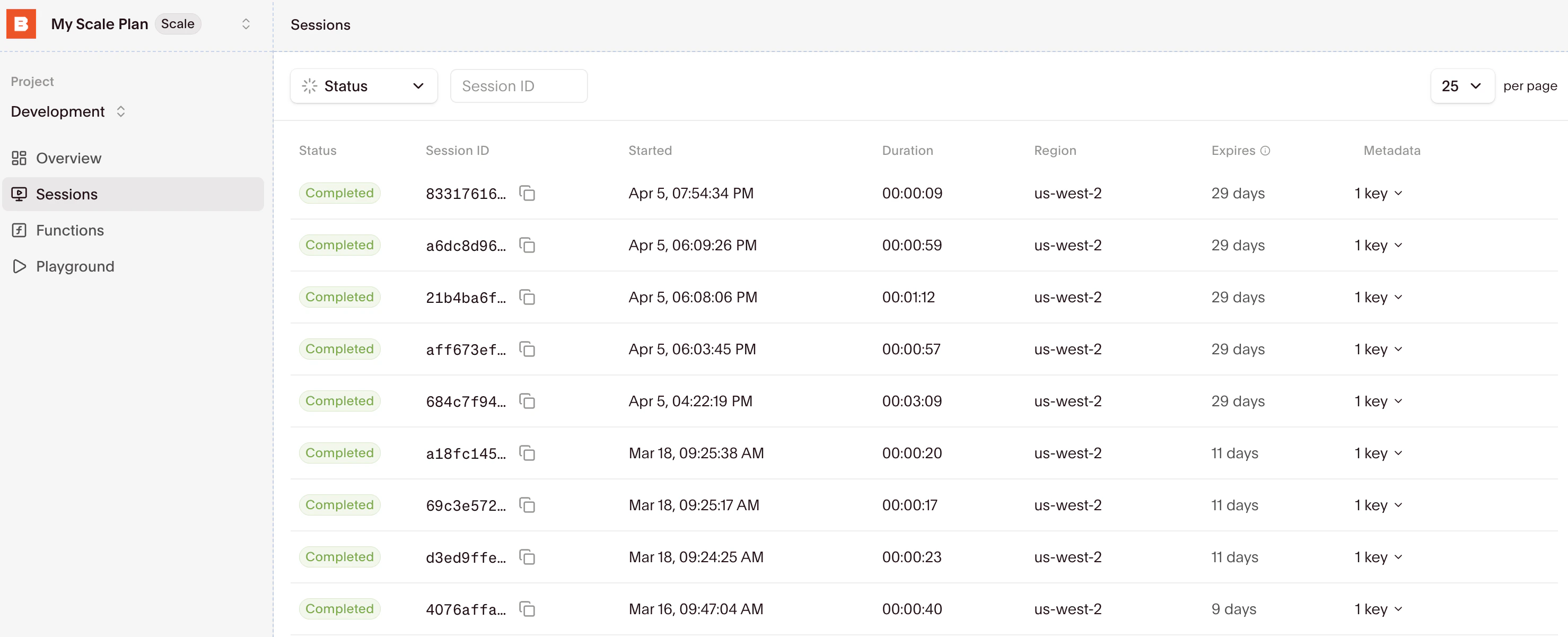 Use the Session Inspector to watch sessions in real time, view replays, or inspect logs.Sessions list